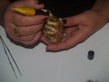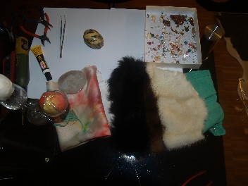 Die Werkzeuge die ich benutze sind : Schere, Bleistift, Millimeterpapier, Kleber, Zange, Pinzette, Pappe. Die Eier die ich vom Bauer hole werden gründlich gereinigt. Da die Grösse der Eier unterschiedlich ausfällt schneide ich die Stoffe nach Mass. In meiner Kollektion befinden sich auch Schmuckeier die aus indischen Chinzstoffen reich verziert mit Messing und metallischem Garn zu sehen sind. Das Trennungsband besteht aus metallischem Garn und ist daher der einziger Stoff der nicht aus Naturfasern gemacht worden ist.